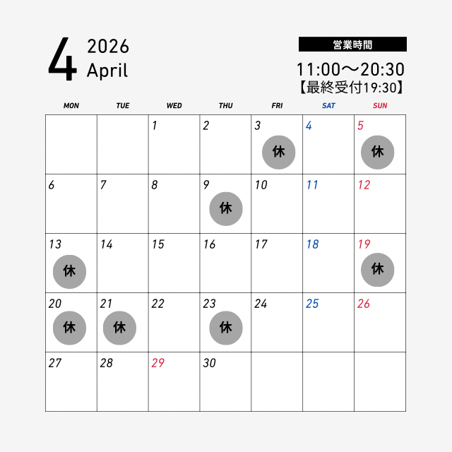 11:00~20:30 (最終受付19:30)